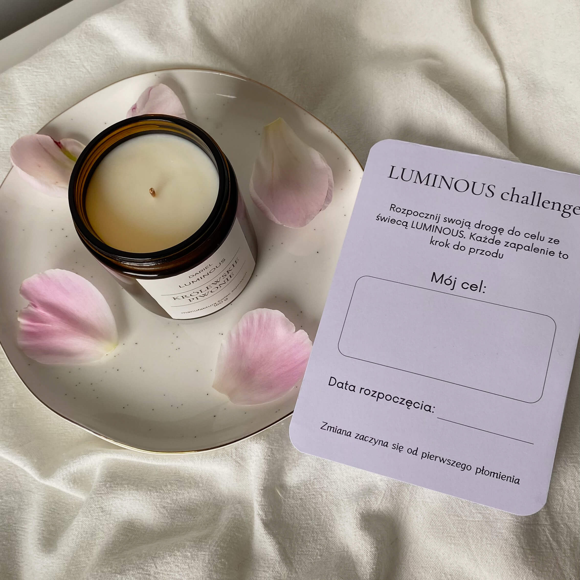 Każda świeca zawiera karteczkę LUMINOUS Challenge – Twojego towarzysza w drodze do celu. Wykorzystaj czas palenia świecy na rozwój i realizację swoich zamierzeń.